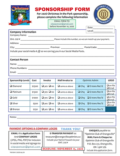 It is with the generous financial support from Sponsors & Donors of Christmas in The Park, our only fundraiser, that we are able to support and participate in programs that enrich the lives of youth in our community, such as: Big Brothers Big Sisters, Dufferin Fire Venturers & Rovers, 4th Orangeville Scouts, Girl Guides 1st Rangers, Orangeville Flyers Hockey, Little Rocks Curling, ODSS and Westside Bursaries, and Optimist Club: Bike Roadeo, Junior Golf, Canadian Children's Optimist Foundation, Youth Empowerment Day, Oratorical and Essay Contests, and COLS (Central Ontario Leadership Seminars, and more. As well as annual donations to Orangeville Food Bank, the Westminster Milk program, DCAFF, Family Transition Place, Headwaters Hospital, etc.